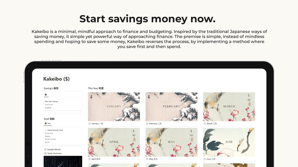 Kakeibo is a minimal, mindful approach to finance and budgeting. Inspired by the traditional Japanese ways of saving money, it simple yet powerful way of approaching finance. The premise is simple, instead of mindless spending and hoping to save some money, Kakeibo reverses the process, by implementing a method where you save first and then spend.