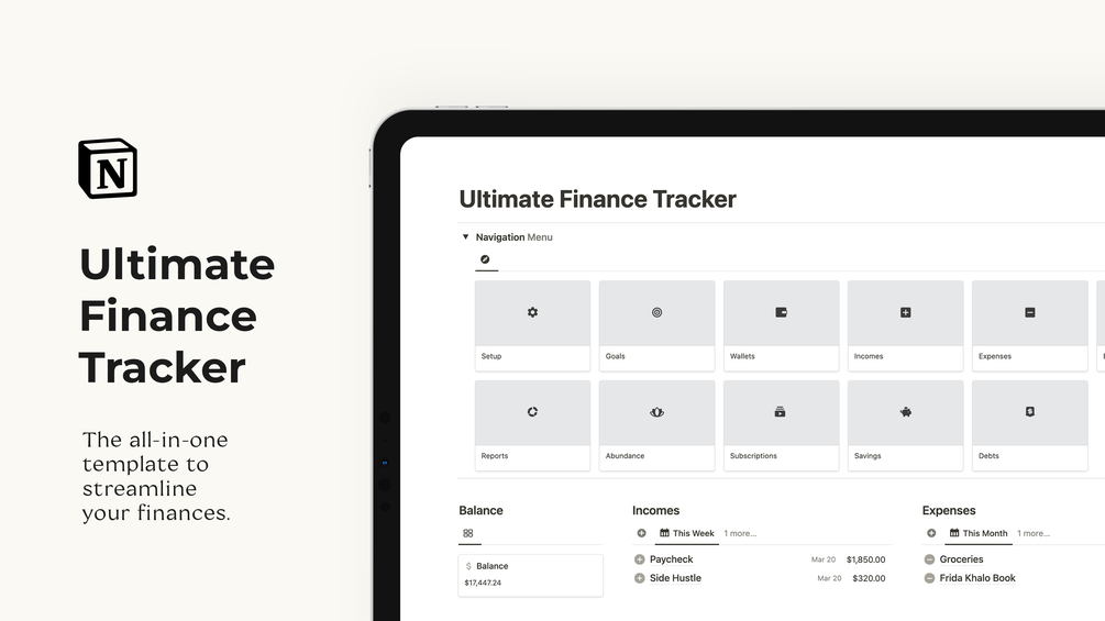 The all-in-one tool to manage your finance.The Ultimate Finance Tracker is a comprehensive system that helps you get on top of your spending and saving goals, pay off debt faster.