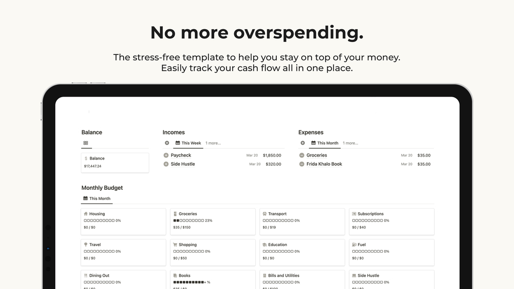 The Ultimate Finance Tracker for Notion is 18+ pages operating system designed to help you streamline your finance, become more mindful of your spending, achieve your financial goal and develop an abundance mindset. All in one place.