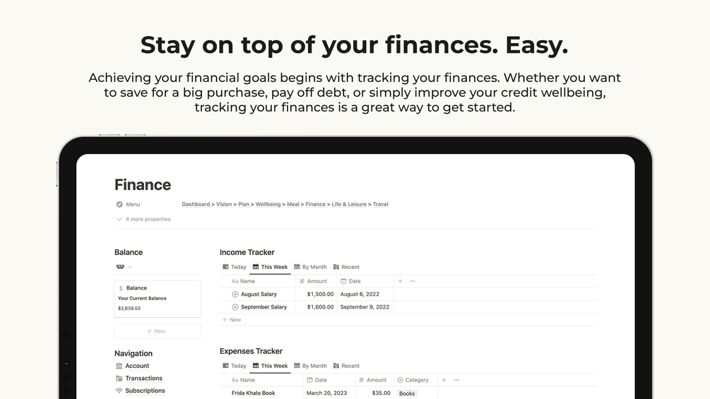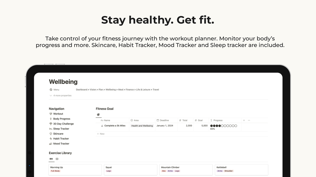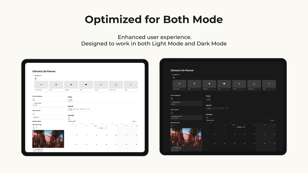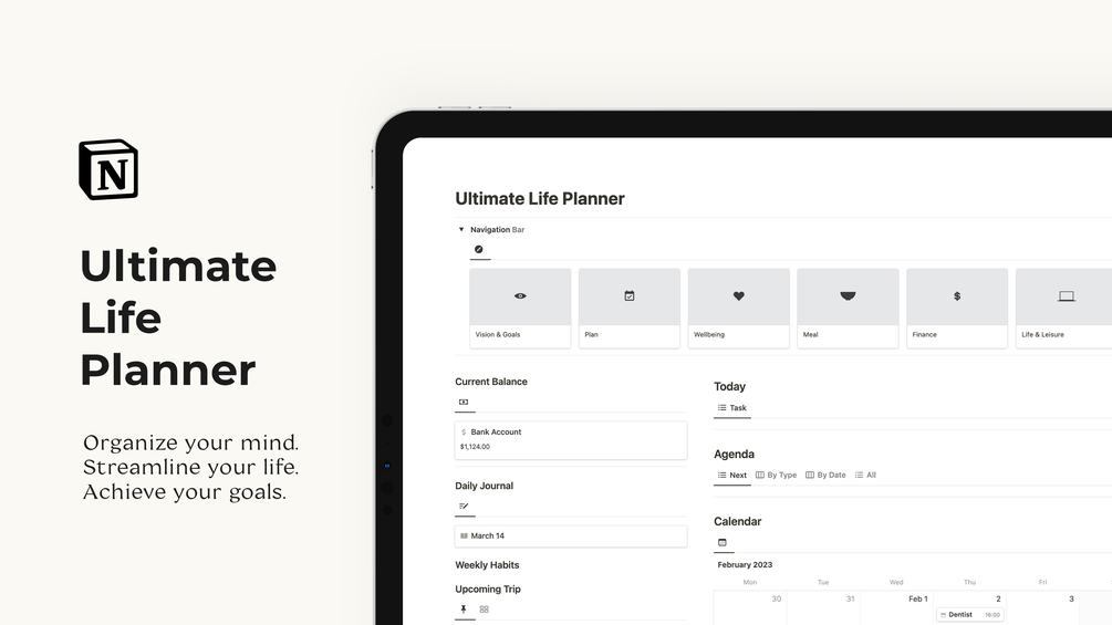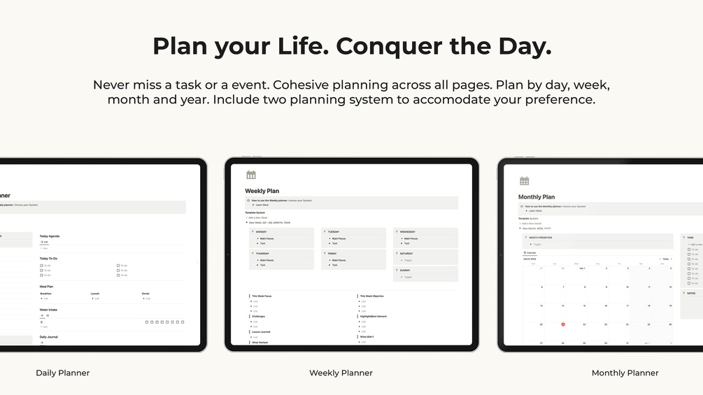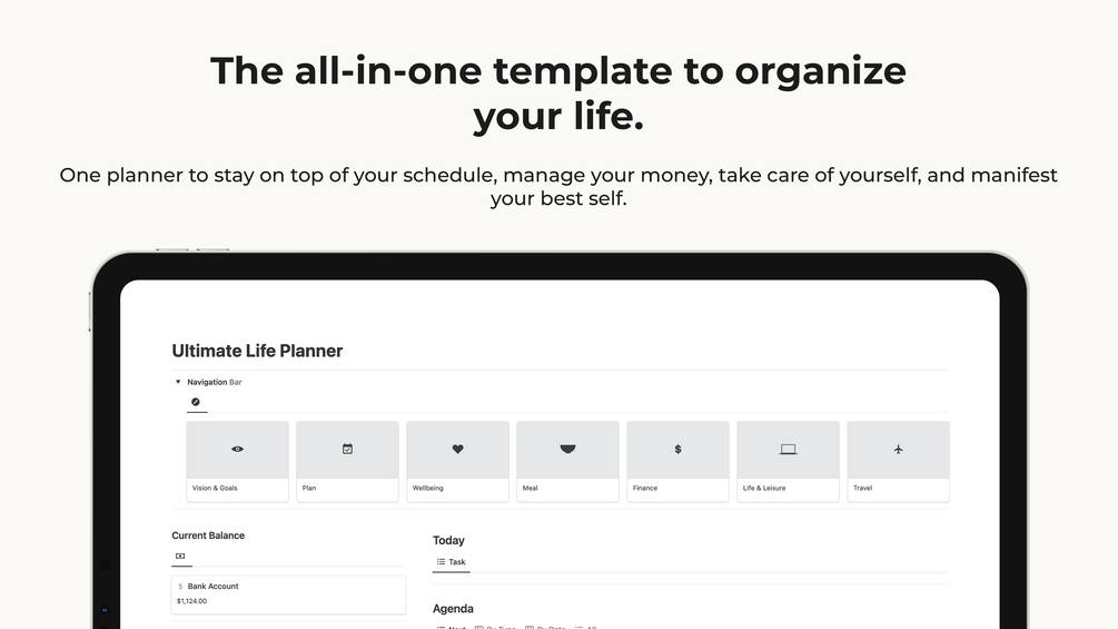 Organize your task and agenda with a mindful designed Notion Template with more than 25+ pages crafted to help you conquer the day and manifest your best self. From vision board to leisure time, the planner features everything you need to get your life together.